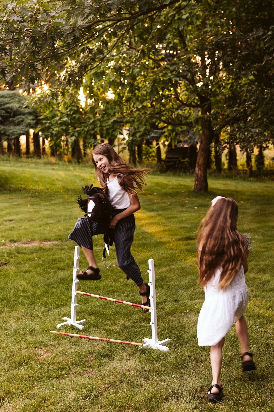 Dank seines robusten Designs fördert das Steckenpferd große Bewegung und Spielspaß draußen: Kinder können Hindernisse überspringen, die Umgebung erkunden und sich dabei gesund bewegen.