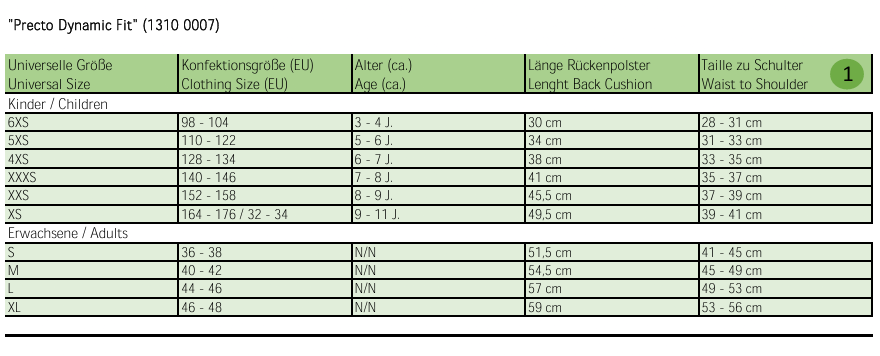 Größentabelle Rückenschutz "Precto Quick Fit":