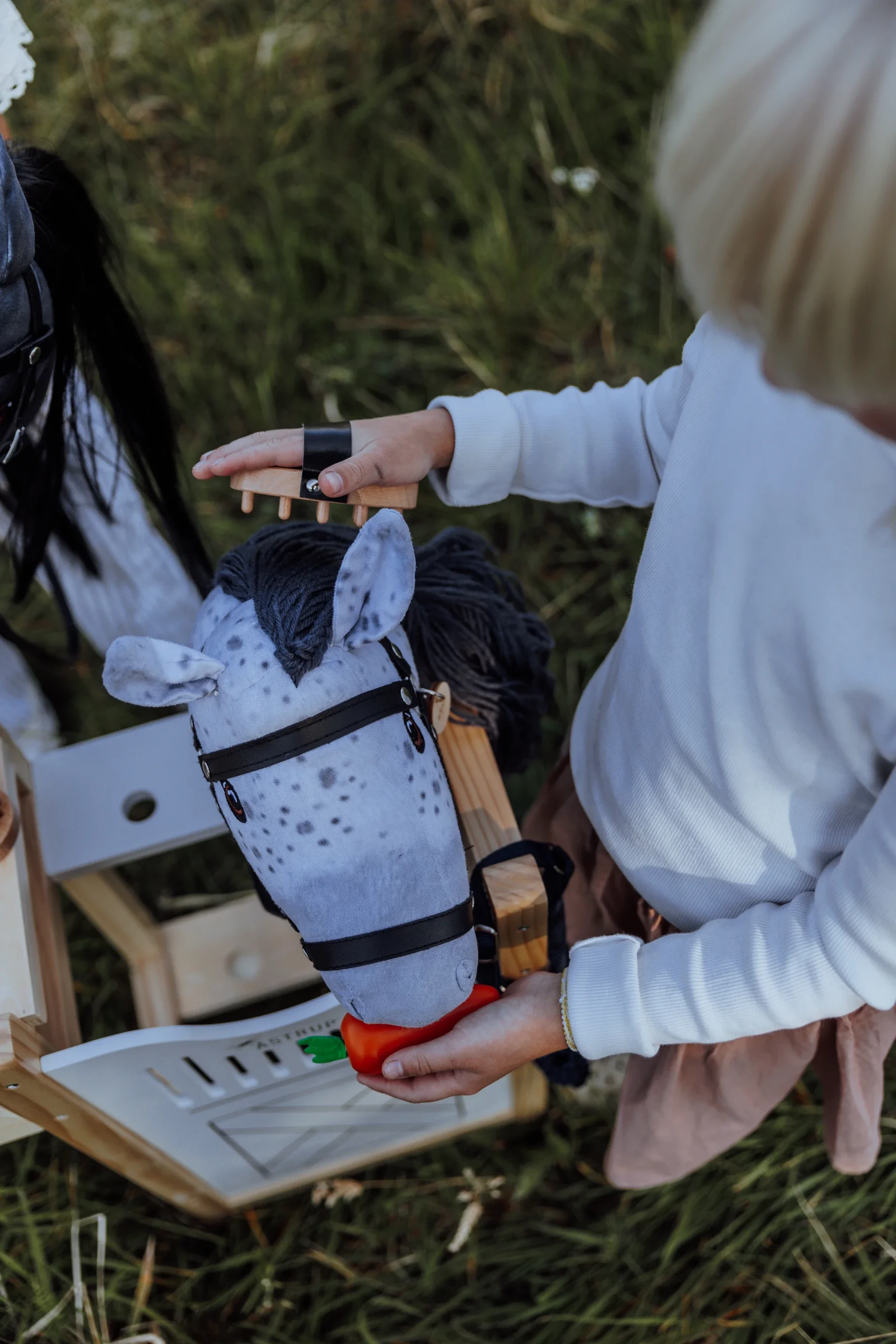 Jedes Steckenpferd wird mit Zaumzeug und weichem grauem Samtrucksack geliefert – perfekt, um das Pony überallhin mitzunehmen. Ein Geschenk, das Spielspaß, Kreativität und Entwicklung gleichermaßen fördert.